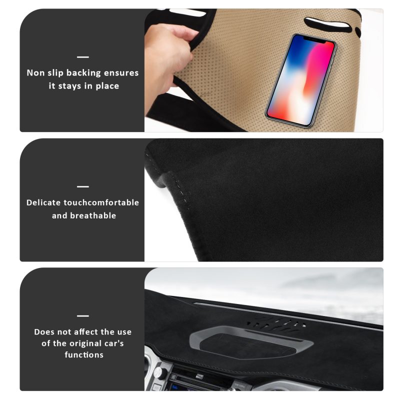 - [Excellent Material] Dash Board Cover Mat consists of 3 layers: High Quality Suede-like fabric surface, Sandwich heat insulation cotton and Silicone Sheet anti-slip backing. It is soft and soothing to the touch.