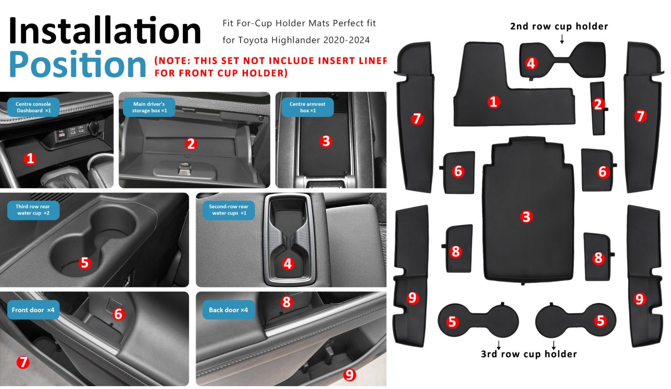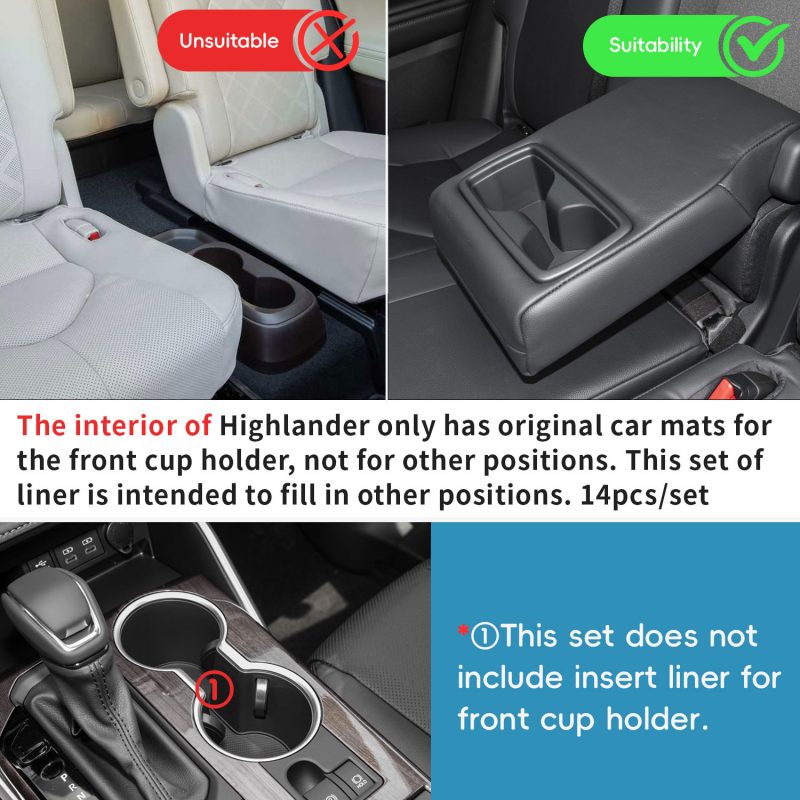- The interior of Highlander only has original car mats for the front cup holder, not for other positions. This set of liner is intended to fill in other positions, such as the front console and door slot pockets. 14pcs/set (NOTED: This set does NOT INCLUDE INSERT LINER FOR FRONT CUP HOLDER.)