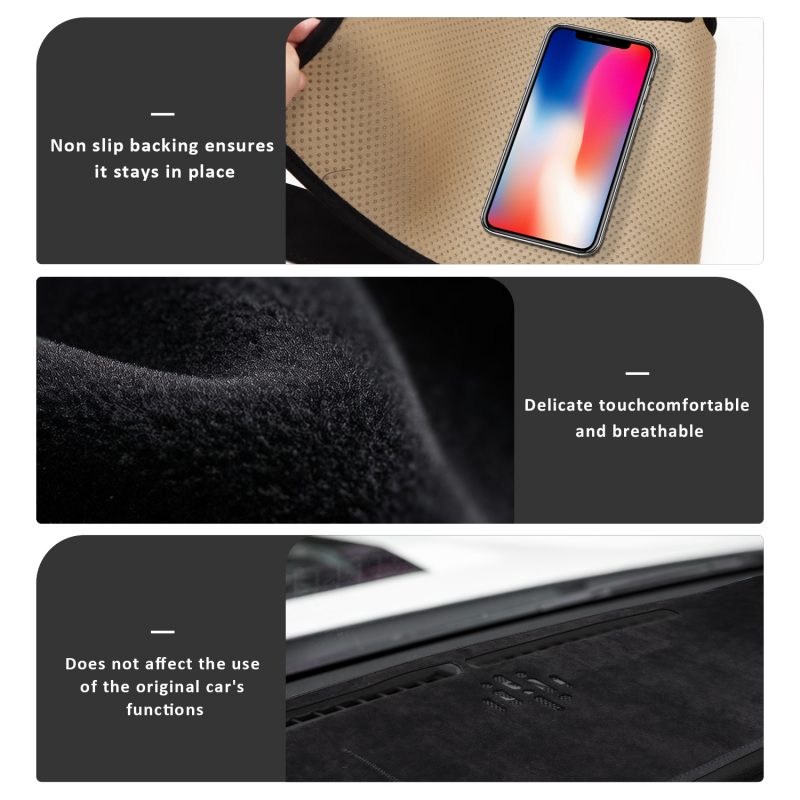 • [Excellent Material] Dash Board Cover Mat consists of 3 layers: High Quality Suede-like fabric surface, Sandwich heat insulation cotton and Silicone little dots anti-slip backing. It is soft and soothing to the touch.