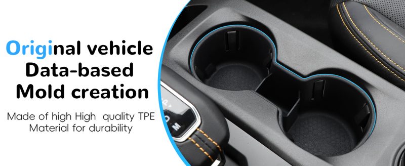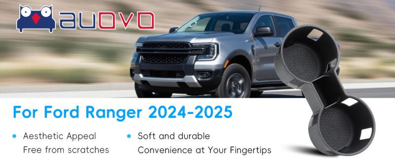 Auovo Cup Holder Insert for 2024-2025 Ford Ranger. Crafted with 3D scanned original vehicle data, it fits perfectly and blends seamlessly with the interior. Its anti-slip design keeps cups steady, preventing spills and shakes, while protecting the Ranger from scratches and stains. Tool-free installation allows easy insertion and removal. When dirty, a quick water wash cleans it thoroughly. Made of durable TPE material, it resists deformation and wear for long-term use. The sleek pure black look complements the interior flawlessly.