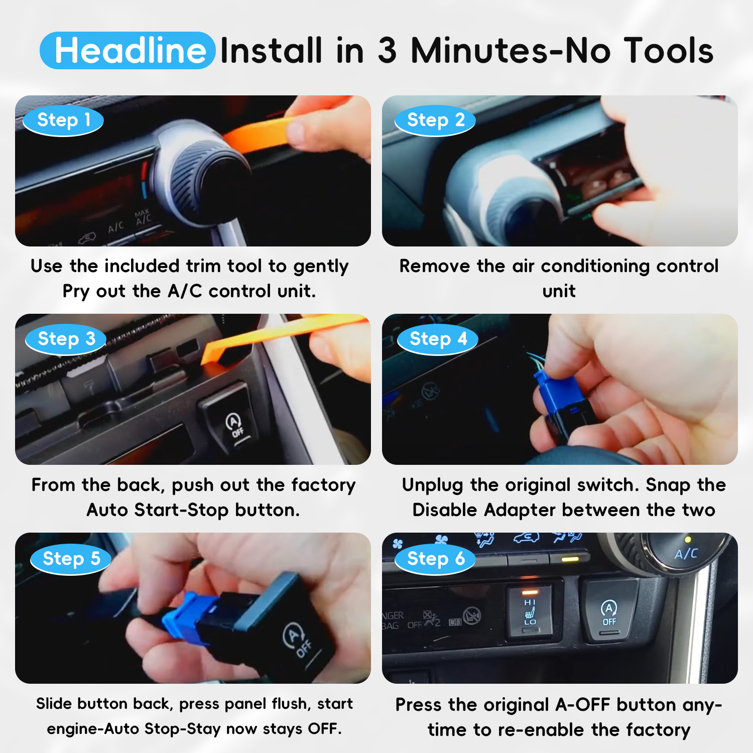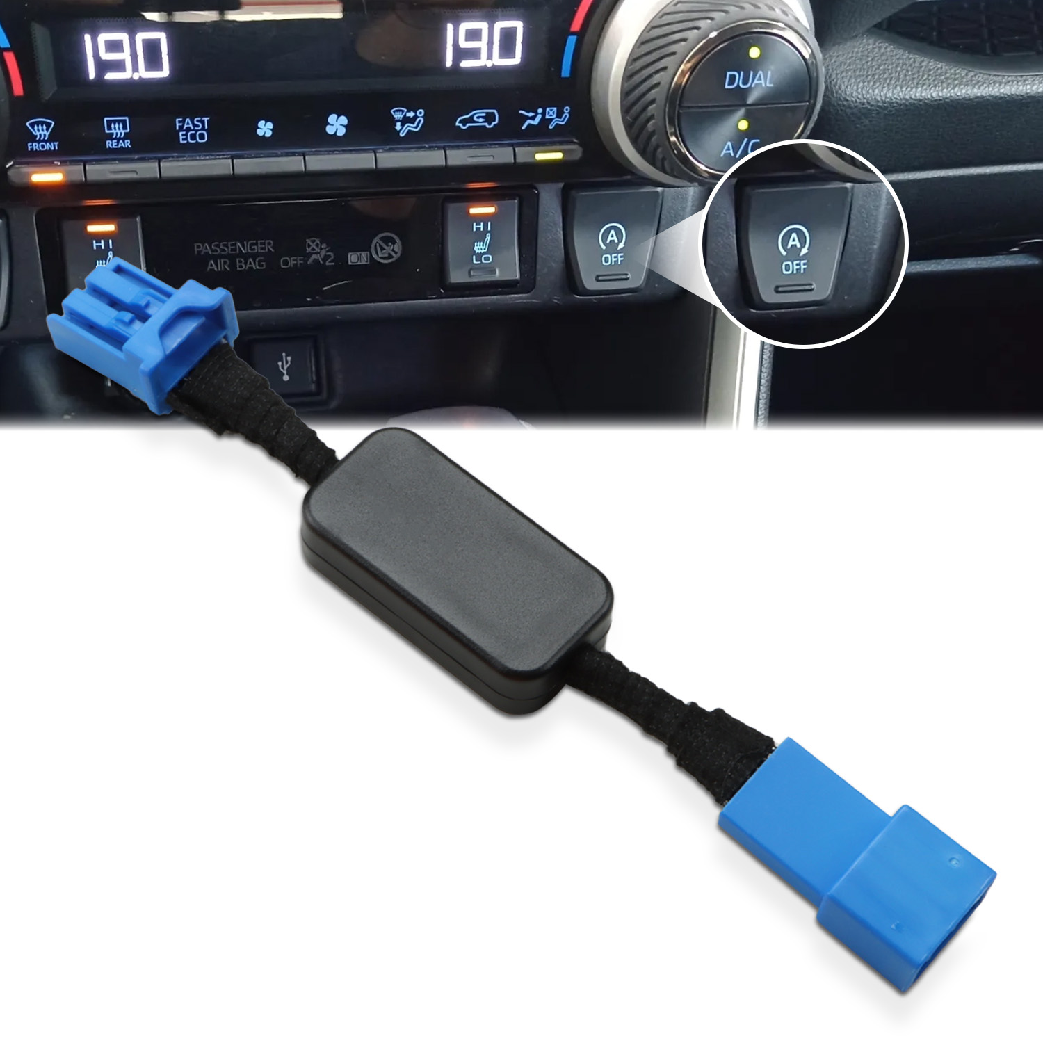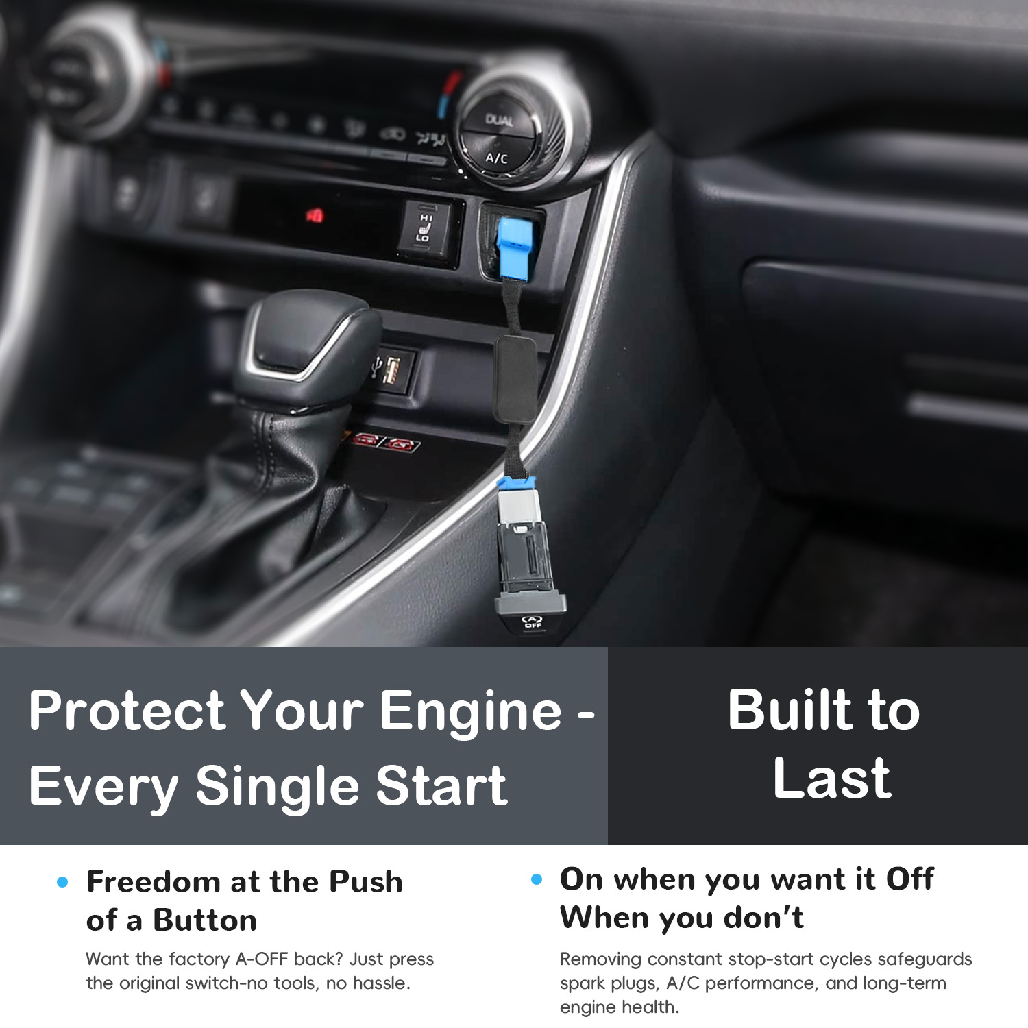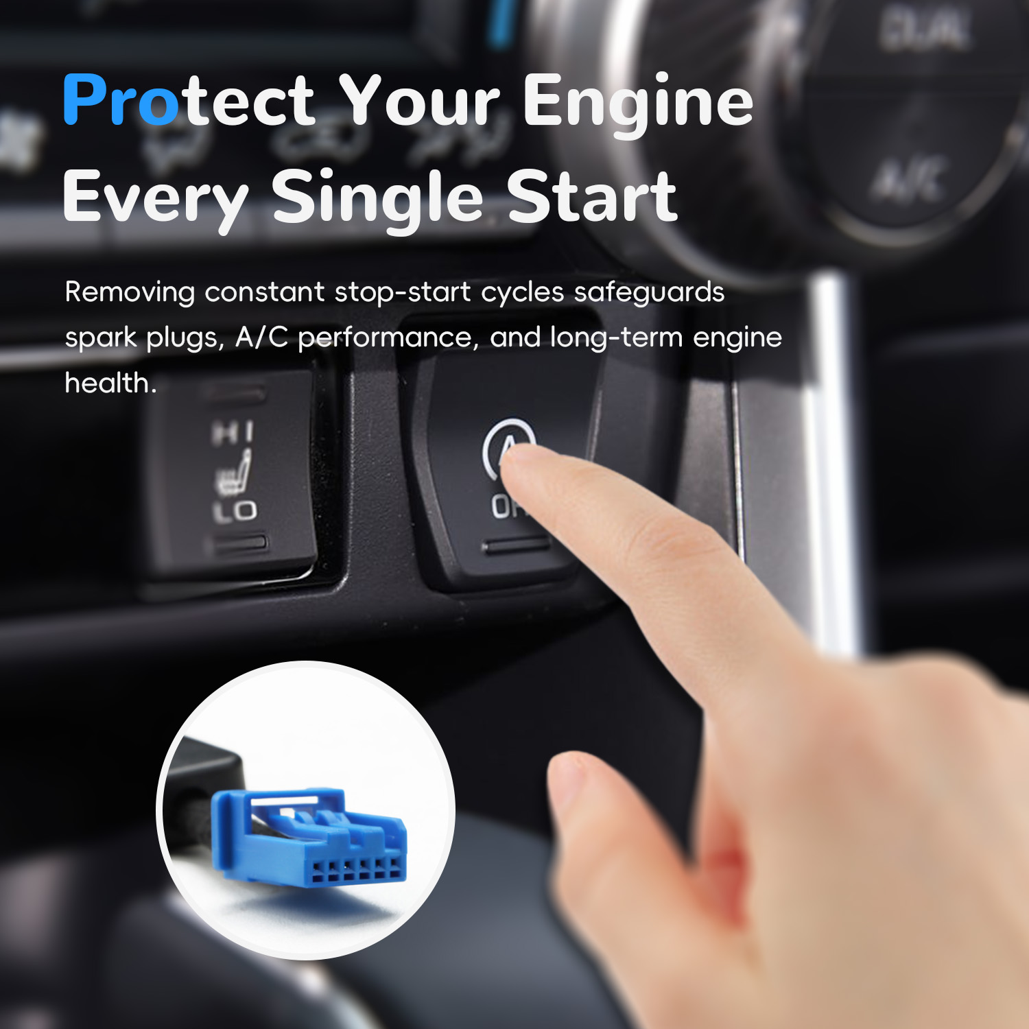 - 【Auto Start Stop Eliminator】After installing the Start Stop Eliminator, the default setting turns off the A-OFF function, eliminating the need for you to manually disable it each time. If you want the A-OFF function work again, simply press the A-OFF button to reactivate it.