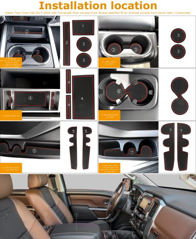 - 1.FIT FOR – fit for Nissan Titan Crew Cab 2019 2018 2017 with Full length Floor console Front Bucket seat(Not fit for Armrest console front bench seat )