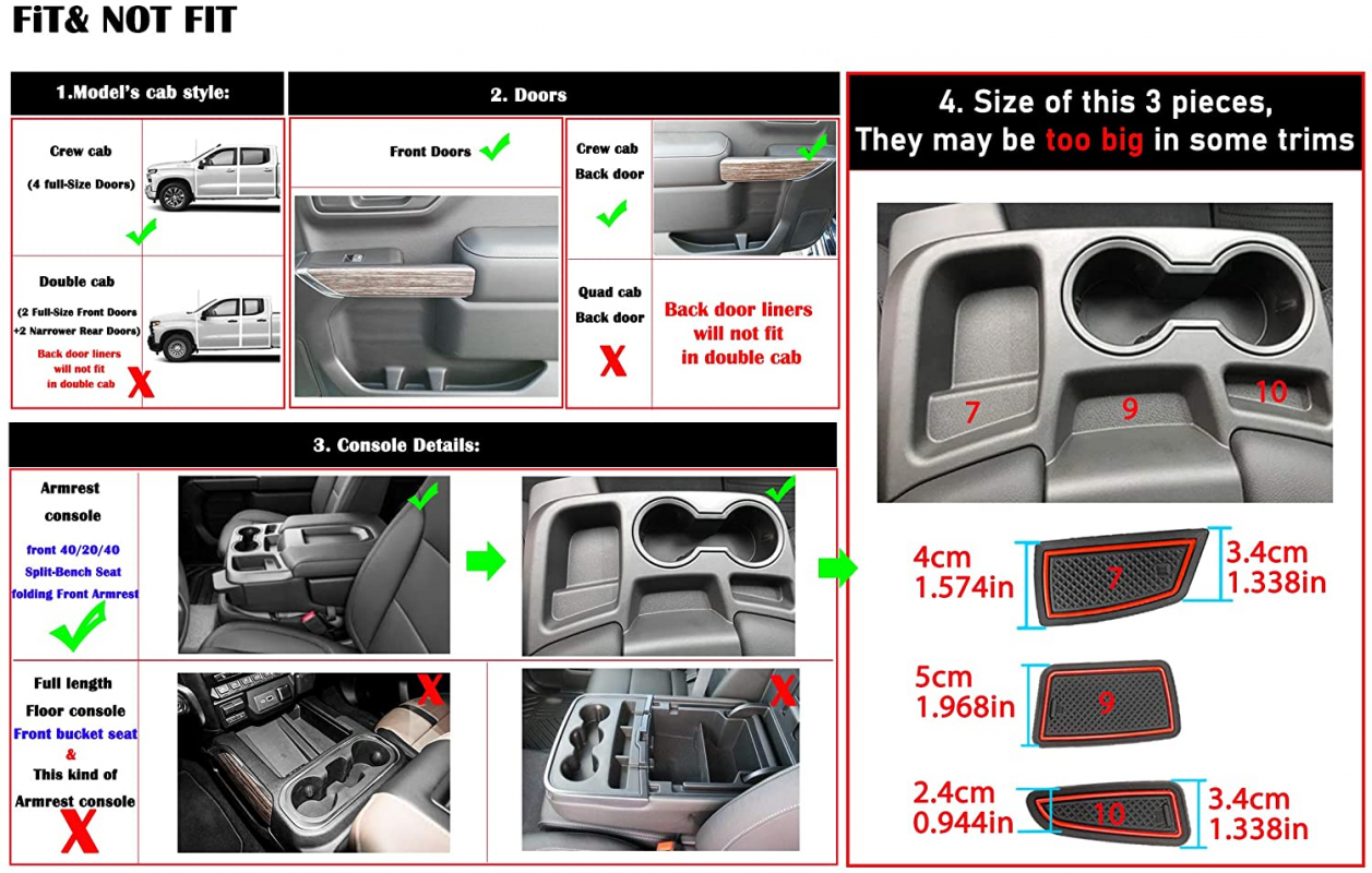 - 2.NOTE: ①for Chevy Chevrolet Silverado 1500 or for GMC Sierra 1500 2019 2020 2021 2022 ; ②CrewCab; ③ front 40/20/40 Split-Bench Seat folding Front Armrest.