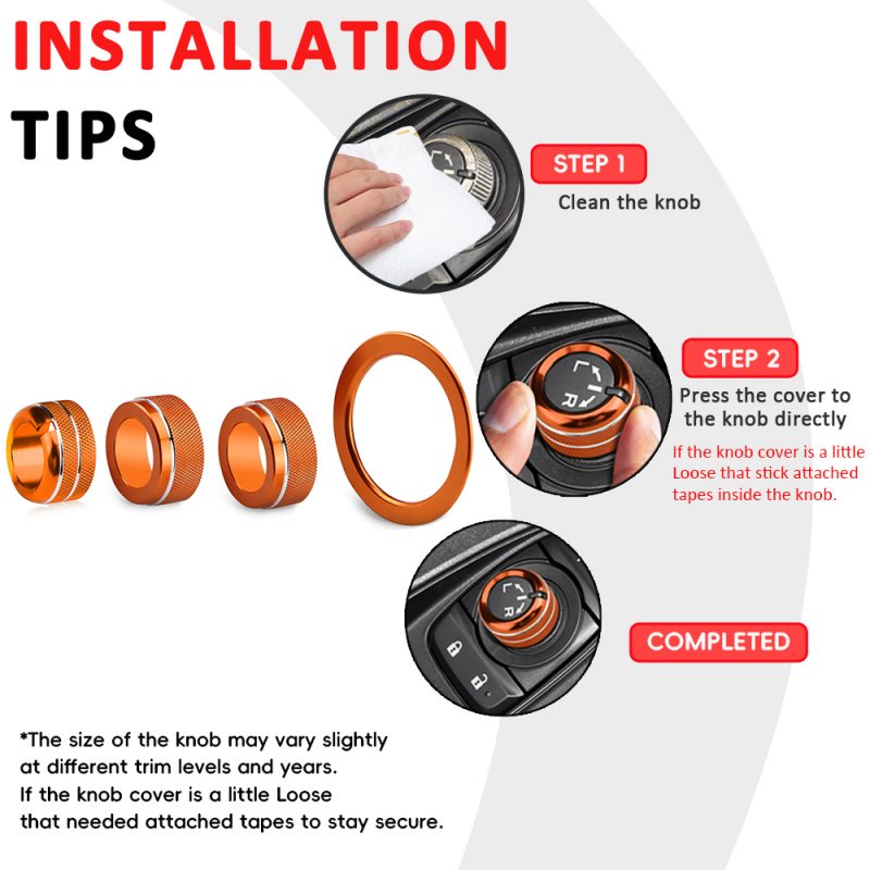 【EASY TO INSTALL】4pcs/set=1 piece engine start stop button outer ring + 2 pieces Radio Knob Covers+ 1 piece Rearview Mirrors Knob Ring. There is Self-Adhesive tape on the back of the engine start stop button switch outer ring, just peal the backing tape off and stick it on. Install the Radio Knob Covers direstly.