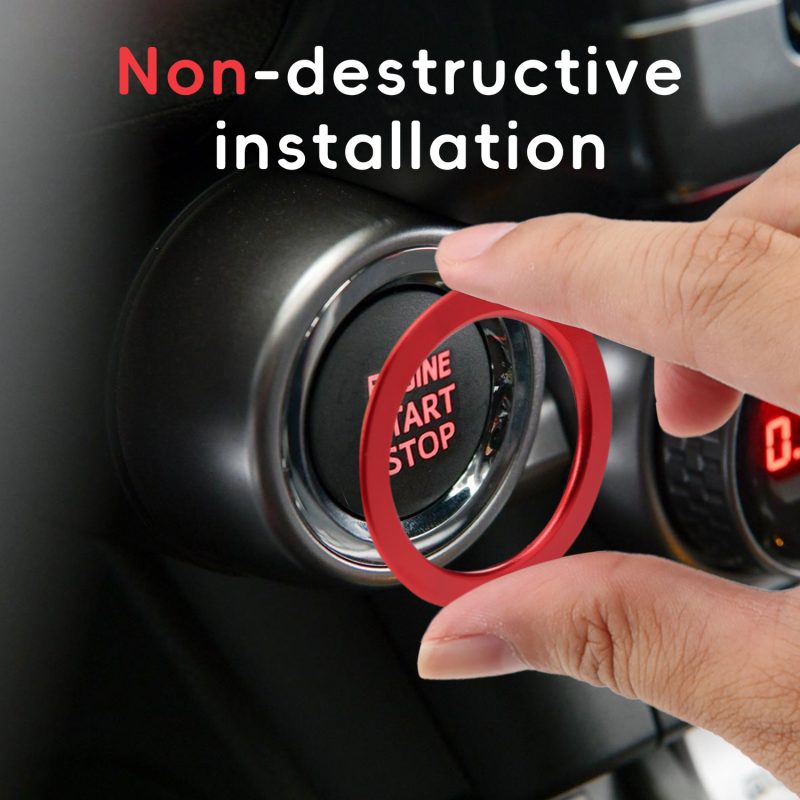 [Easy Installation] Align the Engine Start Stop Button Outer Ring to the knob position to check the fiting. There is Self-Adhesive tape on the back of the engine start stop button switch outer ring, just peal the backing tape off and stick it on.