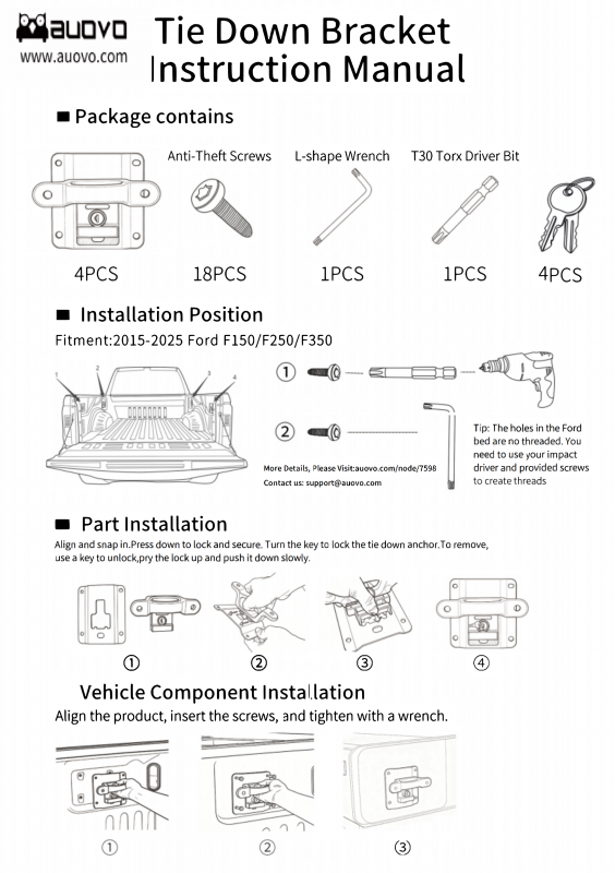 Package contains 4 pcs tie down anchors, 8Keys, 18pcs Anti-Theft Torx Screws (2 pcs extra Screws for spare using), 1pcs T30 L-Shape Wrench, 1pcs T30 Torx Impact driver Bit.