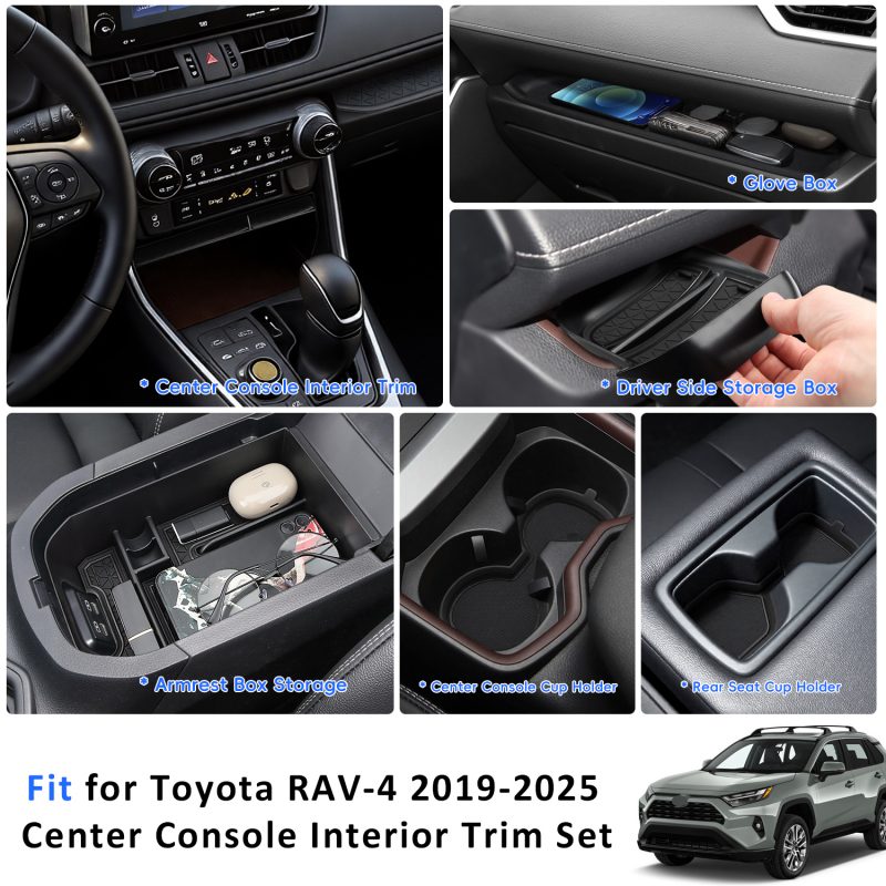 【Package contains】 6 pcs for Toyota RAV4 2019-2025 contains Center Console Cup Coaster & 2-nd Row Cup Coaster & Armrest Organizer & Driver Storage Drawer & Passenger Storage Mat & Gear Shift Tray