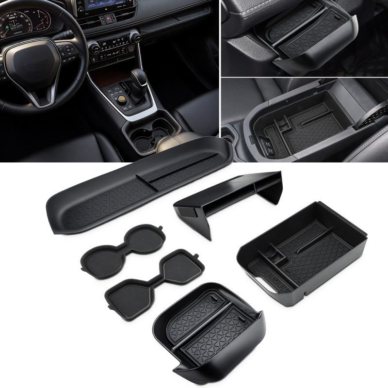 【Package contains】 6 pcs for Toyota RAV4 2019-2025 contains Center Console Cup Coaster & 2-nd Row Cup Coaster & Armrest Organizer & Driver Storage Drawer & Passenger Storage Mat & Gear Shift Tray